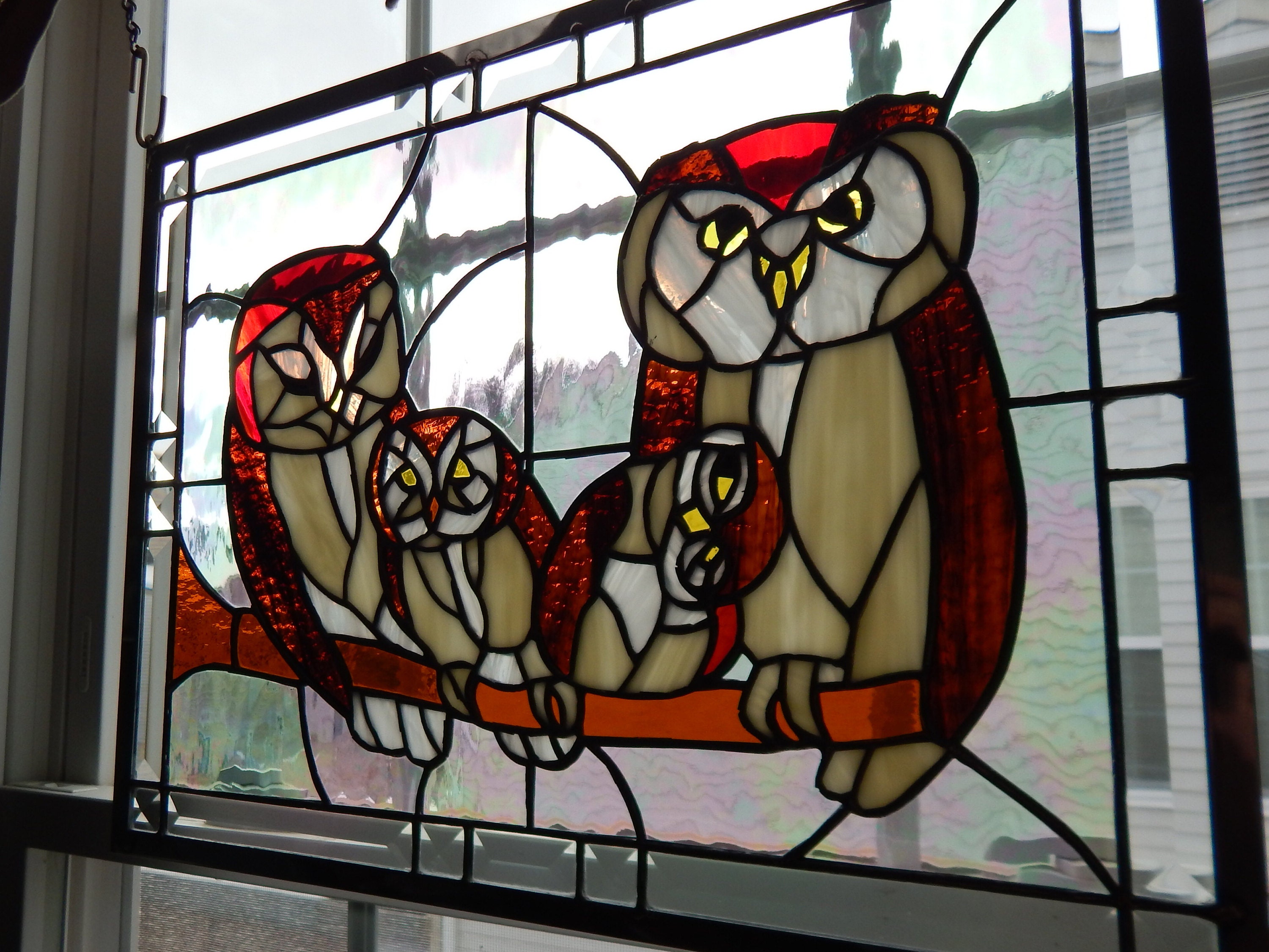 This delightful stained glass panel exceeded my expectations (it's beautiful even on a gloomy day)! I love how this very talented artist depicted the owls so that it's obvious who is the mom and who is the dad. I've sent pictures to friends and everyone else loves it too. The artist/seller is friendly and conscientious. It was a pleasure doing business with her. The panel was perfectly packed and it arrived with lightning speed in pristine condition. I highly recommend Sunny Stained Glass Art!